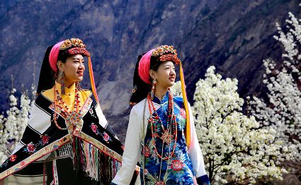高大挺拔的梨樹如星星般散落在獨具特色的嘉絨藏族民居和古老碉樓附近。眼前看到的是雪白的梨花,身邊走過的是笑容比梨花還甜的藏族姑娘,交融成一道絕美的風(fēng)景線。