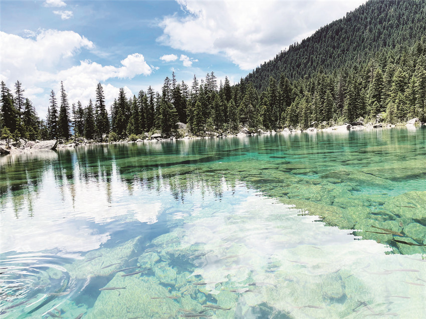 措普溝匯集了山川景物的精華,雪峰、冰川、原始森林、湖泊、河流、峽谷、瀑布、溫泉、草原、野生動植物、藏族風(fēng)情。特別是被雪山半環(huán)繞的措普湖,有山有水,顏色層層遞進,清澈見底,在陽光的折射下波光粼粼。