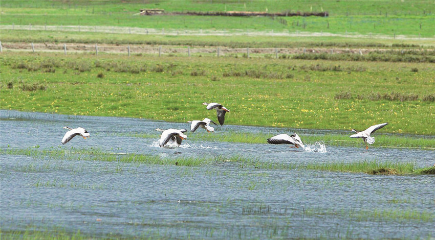 拉龍措古冰漂濕地旅游景區(qū)里有近百種植被,以及黑頸鶴、黑鸛、金雕、胡兀鷲等鳥類動物。陽光下的拉龍措,波光粼粼,斑頭雁在湖面“飛舞”,潔白的羽毛伸展后露出圍繞的黑邊,宛若芭蕾舞者在湖面起舞……
