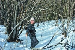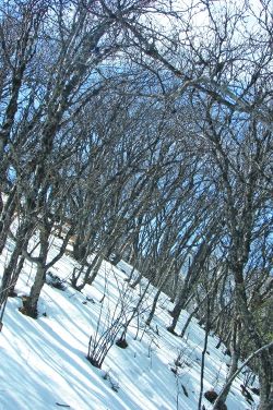 在馬鞍山頂?shù)谋泵婕氨逼?,有一片望不到邊際的樹(shù)林。冬天的這片樹(shù)林,呈成熟而貴氣的暗褐色,葉落枝出,紛亂、素凈、蕭瑟、清貴。于是,以雪地和樹(shù)林作背景,也照了不少相。