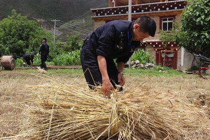 “不能讓鄧珠家成熟了的小麥爛在地里。”近期,巴塘縣陰雨天氣給當(dāng)?shù)卮迕袷崭钚←湈聿槐?。該縣夏邛派出所民警自發(fā)來到夏邛鎮(zhèn)河西村特困戶鄧珠家田地,以最快的速度幫助收割、捆綁、脫粒等一系列搶收工作。據(jù)悉,夏邛派出所民警在開展“一標三實”工作時,將當(dāng)?shù)乩щy戶、殘疾戶、五保戶等缺少勞動力的家庭銘記在心,每逢播種秋收都會進行幫助。