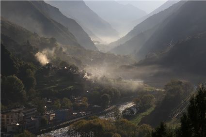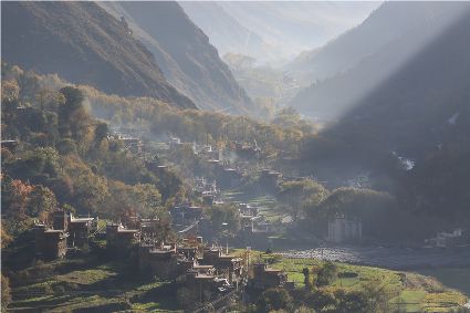 落日將最后一道霞光在山尖劃過,暗夜便裹挾這寒意搖動(dòng)起山林中的樹木。風(fēng)漸緊,那已經(jīng)稀稀落落的樹葉隨著風(fēng)的韻律,跳起歡快的鍋莊,仿佛在告別這一年的繁華。突如其來的大雪,給丹巴的二月涂上白色的記號(hào)。從山尖到院前的樹上,一溜兒雪白,正應(yīng)了“忽如一夜春風(fēng)來,千樹萬樹梨花開”的情景,讓人忍不住伸出手指看看這花是真是假。大雪過后,陽光如約而至撒滿藏寨,金色陽光和蒸騰的白霧縈繞在雪白的山頭,與山下的古碉藏寨,河畔的清流巧妙地構(gòu)成一幅絕美畫卷,讓人仿佛身處仙境。吸足了養(yǎng)分的柳樹終于抽出綠芽送來春天的信號(hào),那柳條兒在細(xì)風(fēng)吹拂下宛如少女對鏡梳妝,在陽光下顯得無比溫柔,讓人不禁想貼近它們,感受這溫暖又靜謐的溫柔。