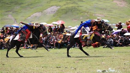 7月23日,四川甘孜藏族自治州理塘縣村戈鄉(xiāng)賽馬活動(dòng)開(kāi)始,牧民們?cè)隈R背上一顯身手。每年藏歷六月,當(dāng)草原上格桑花盛開(kāi)的時(shí)候,四川省理塘縣24個(gè)鄉(xiāng)(鎮(zhèn))就會(huì)按照習(xí)俗舉辦隆重的賽馬會(huì)來(lái)拜祭神山,慶祝豐收。迄今有400多年歷史的賽馬分為耐力賽、小走賽、馬術(shù)賽等,其中最為精彩的是馬術(shù)賽:馬肚藏身、馬背倒立、飛騎射擊、拾哈達(dá)等,驚險(xiǎn)刺激。2008年6月,此項(xiàng)活動(dòng)被列入四川省級(jí)非物質(zhì)文化遺產(chǎn)保護(hù)項(xiàng)目。(朱虹 葉強(qiáng)平)