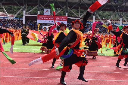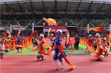 “本屆少數民族傳統(tǒng)體育運動會的會徽以格薩爾王賽馬登位為基本形象,由字母‘SC’組成的騎手代表‘四川’,數字‘15’組成了昂揚奔騰的‘馬’為主體的形象,代表‘15屆民運會’。這既有藏民族特色,又顯得美觀大方?!痹陂_幕式現場,來自杭州的陳琳興致勃勃地說。