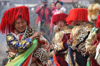 除了歌舞文化,德欽還是民俗文化最大的平臺,神山祭祀是村村寨寨必不可少的活動,在德欽,藏民對山水自然賦予了靈性,認為自然也是和人一樣有著生命和靈性,尊重自然演繹出神山祭祀活動豐富多彩?!暗顿潯?藏語稱“百諧”。在德欽農(nóng)村,刀贊是祭祀活動的重頭戲,這一天,不亞于一個盛大的服飾表演。相傳“百諧”是古時村民為消除戰(zhàn)亂,祈福平安的一項傳統(tǒng)祭祀活動,延續(xù)至今已經(jīng)成為一項傳統(tǒng)的民俗活動。“百諧”既是祭祀活動的一個儀式,也是一個獨立的傳統(tǒng)民俗活動,村里每戶一男丁在這一天必須參加“百諧”?!疤K夏”是村里男人戴的最為隆重的帽子,他不同于金邊帽和狐皮帽。長刀是“刀贊”的道具, “吉祥的日子里,我們一敬天地,賜給我們帶來幸福的生活;再敬尊敬的共產(chǎn)黨,為我們帶來平安吉祥;三敬慈祥的雙親,教會我們?nèi)绾巫鲆粋€好人……”朗朗上口的說詞伴著閃閃的刀光起舞,頗具康巴壯士的英武陽剛。