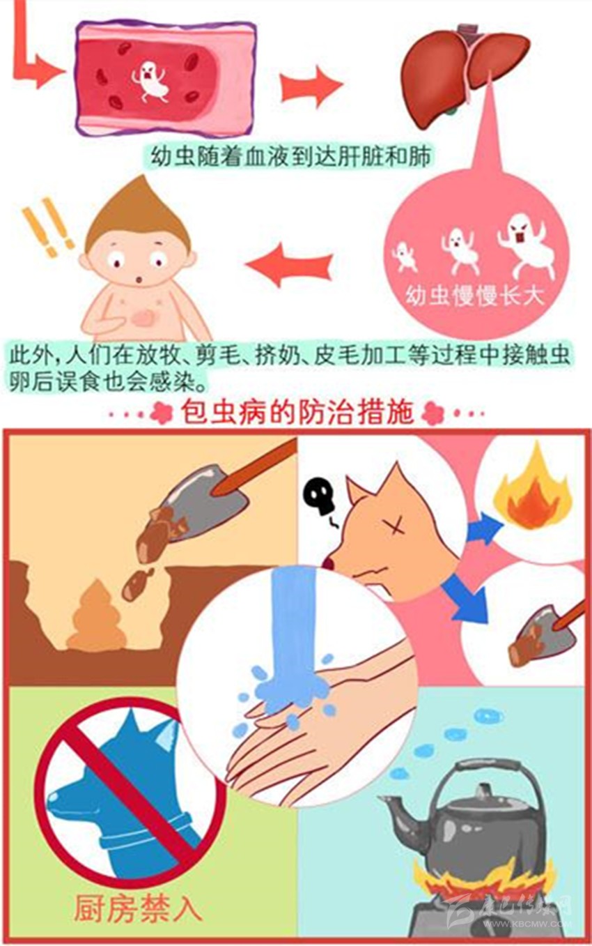 我們先看包蟲(chóng)病的發(fā)生過(guò)程:狗、狼、狐貍等食肉動(dòng)物食入感染棘球幼蟲(chóng)(棘球蚴囊里可會(huì)有數(shù)百萬(wàn)個(gè)棘球幼蟲(chóng))的羊、牛、豬、馬、鹿、兔、鼠的生內(nèi)臟或未熟的肉類(lèi)后,棘球幼蟲(chóng)在它們小腸腸壁隱窩內(nèi),經(jīng)7-8周生長(zhǎng),發(fā)育成為米粒大小的成蟲(chóng)——棘球絳蟲(chóng)。成蟲(chóng)有頭、頸、體節(jié),體節(jié)中有成節(jié)和孕節(jié),成蟲(chóng)無(wú)雌雄之分,屬于雌雄同體,每隔7-14天蟲(chóng)卵形成,孕節(jié)脫落隨糞便中排出,成節(jié)再發(fā)育為孕節(jié);同時(shí),成蟲(chóng)還可自然下滑其肛門(mén)引起肛門(mén)發(fā)癢,這時(shí)狗、狼、狐貍等回頭用舌舔、牙咬,孕節(jié)被壓碎,蟲(chóng)卵排出。脫落的孕節(jié)可沿草地或植物蠕動(dòng)爬行,孕節(jié)邊走邊下蛋,導(dǎo)致蟲(chóng)卵四處擴(kuò)撒。蟲(chóng)卵細(xì)小,肉眼看不見(jiàn),它在干燥環(huán)境中能存活11-12天,在2℃水中能活2.5年,在冰中可活4個(gè)月。就是這樣蟲(chóng)卵它引起狗自身和與其接觸的羊、牛、豬、馬等家畜的皮毛污染外,它還隨著狗、狼、狐貍等活動(dòng)場(chǎng)所不同污染牧場(chǎng)、畜舍、蔬菜、土壤及水源等環(huán)境;毫無(wú)警惕,多而細(xì)小的蟲(chóng)卵它們易被人和羊、牛、豬、馬、鹿、兔、鼠等草食動(dòng)物誤食吞下,吞食的蟲(chóng)卵它們很快在機(jī)體的腸內(nèi)孵出變?yōu)橛紫x(chóng),幼蟲(chóng)鉆入腸壁,隨血循環(huán)到達(dá)我們和羊、牛、豬、馬、鹿、兔、鼠等草食動(dòng)物的肝、肺、腦、心、腎等器官居住下來(lái),緩慢生長(zhǎng),引起對(duì)應(yīng)部位的包囊蟲(chóng)(又稱(chēng)棘球蚴),出現(xiàn)包蟲(chóng)病。包蟲(chóng)病嚴(yán)重程度取決于包囊蟲(chóng)的體積、數(shù)量、寄生時(shí)間、部位和繼發(fā)反應(yīng),而危害人畜健康和生命安全。