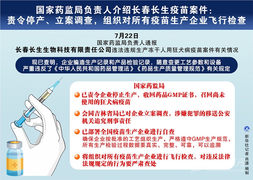 國(guó)家藥監(jiān)局負(fù)責(zé)人22日通報(bào)長(zhǎng)春長(zhǎng)生生物科技有限責(zé)任公司違法違規(guī)生產(chǎn)凍干人用狂犬病疫苗案件有關(guān)情況。這位負(fù)責(zé)人說(shuō),國(guó)家藥監(jiān)局已責(zé)令企業(yè)停止生產(chǎn),收回藥品GMP證書(shū),同時(shí)會(huì)同吉林省局已對(duì)企業(yè)立案調(diào)查,涉嫌犯罪的移送公安機(jī)關(guān)追究刑事責(zé)任。國(guó)家藥監(jiān)局將組織對(duì)所有疫苗生產(chǎn)企業(yè)進(jìn)行飛行檢查,對(duì)違反法律法規(guī)規(guī)定的行為要嚴(yán)肅查處。 這位負(fù)責(zé)人說(shuō),根據(jù)舉報(bào)提供的線索,7月5日,國(guó)家藥監(jiān)局會(huì)同吉林省局對(duì)長(zhǎng)春長(zhǎng)生公司進(jìn)行飛行檢查;7月15日,國(guó)家藥監(jiān)局會(huì)同吉林省局組成調(diào)查組進(jìn)駐企業(yè)全面開(kāi)展調(diào)查。7月15日,國(guó)家藥監(jiān)局發(fā)布了《關(guān)于長(zhǎng)春長(zhǎng)生生物科技有限責(zé)任公司違法違規(guī)生產(chǎn)凍干人用狂犬病疫苗的通告》。