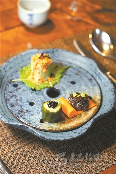 在不少素食店里,廚師會充分利用當(dāng)季食材,不時不食的廣府飲食理念也更為凸顯。慈姑、金桔都是春季的食材,因此被天水蔬食料理運(yùn)用到“雨水”節(jié)氣的菜單里。據(jù)店長介紹,慈姑是生長于水中植物,如同土豆一般軟糯。廚師用南乳和腰果做成堅(jiān)果醬,作為慈姑的配搭醬料。慈姑被切成片,中間夾著梅菜,再用堅(jiān)果醬“粘合”起來,還原慈姑原本的形狀,再通過烤箱烤制,再配搭撒上意大利黑醋的臺山花菜,口感豐富。金桔用來做甜品,將金桔挖空,里頭放入一個核桃,表面再鋪上一層風(fēng)干的金桔果干,做成一件小巧甜品“金桔核桃糖”,其設(shè)計(jì)靈感源自廣東金桔糖。與它一同出場的還有用金桔果肉打醬做成的金桔年糕,也十分甜美。
