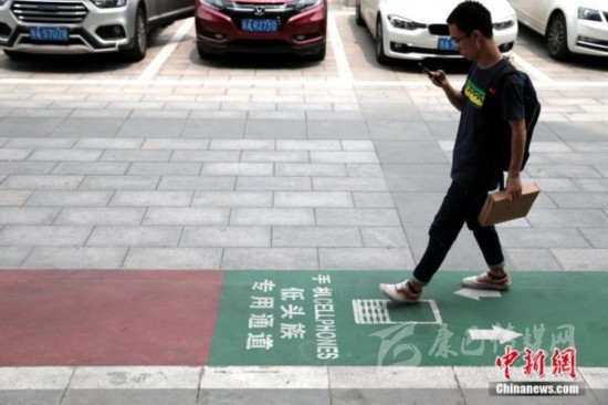 資料圖:西安街頭出現(xiàn)一條專(zhuān)為“低頭族”設(shè)計(jì)的通道。中新社記者 張遠(yuǎn) 攝