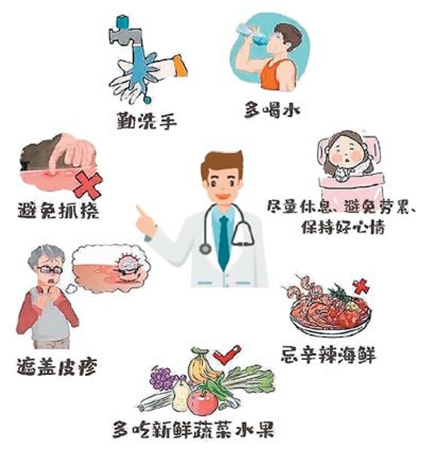 專(zhuān)家提醒,帶狀皰疹主要通過(guò)接觸傳播,抵抗力低的老年人和兒童應(yīng)避免接觸帶狀皰疹患者。與此同時(shí),中老年人以及有自身免疫缺陷的人群要注意休息,合理飲食,加強(qiáng)鍛煉,增強(qiáng)抵抗力;糖尿病、腫瘤等患病人群,要特別留意觀察自身免疫狀況,養(yǎng)成良好生活習(xí)慣,有效控制原有疾??;年輕人也不能掉以輕心,避免頻繁加班、熬夜等導(dǎo)致抵抗力下降。一旦發(fā)現(xiàn)患有帶狀皰疹,要盡快就醫(yī),同時(shí)注意避免抓撓皮疹處,勤洗手、多喝水、多吃新鮮蔬果,忌辛辣及海鮮,多休息,避免勞累,保持好心情。
