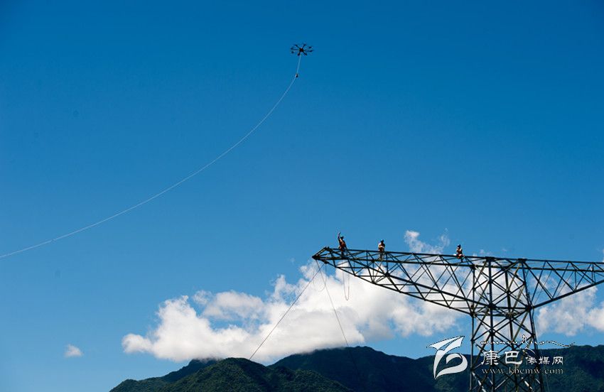 酒泉—湖南電力線路是我國(guó)目前輸電距離最長(zhǎng)的±800千伏特高壓輸電工程,全長(zhǎng)2383公里、投資262億元,預(yù)計(jì)于2017年2月建成投運(yùn)。酒湖線重慶巫溪段共110基輸電鐵塔,70%位于山脊,93.6%的建造需要架設(shè)專(zhuān)用運(yùn)輸索道。 圖為7月15日,掛載著第一級(jí)牽引導(dǎo)線的放線無(wú)人機(jī)在空中懸停配合高空作業(yè)人員完成架線作業(yè)。