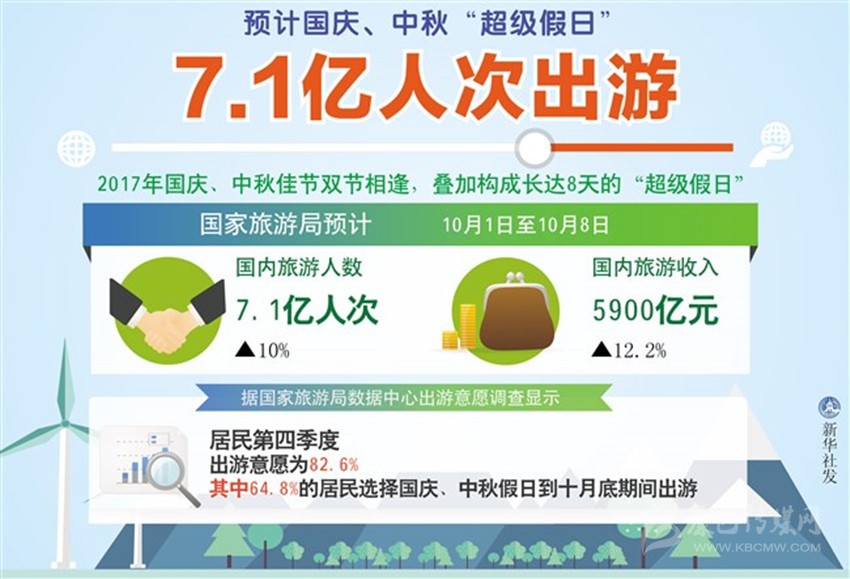 今年國慶、中秋佳節(jié)雙節(jié)相逢,疊加構(gòu)成長達(dá)8天的“超級假日”。國家旅游局預(yù)計(jì),10月1日至8日國內(nèi)旅游人數(shù)將達(dá)到7.1億人次,國內(nèi)旅游收入將達(dá)到5900億元,較去年同期分別增長10%和12.2%。