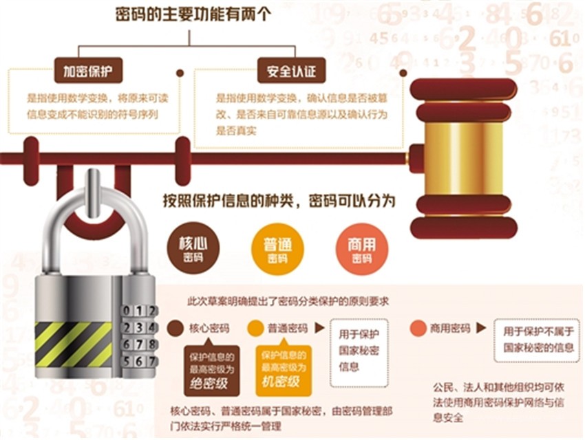按照保護(hù)信息的種類,密碼可以分為核心密碼、普通密碼和商用密碼。此次草案明確提出了密碼分類保護(hù)的原則要求:核心密碼、普通密碼用于保護(hù)國家秘密信息,核心密碼保護(hù)信息的最高密級(jí)為絕密級(jí),普通密碼保護(hù)信息的最高密級(jí)為機(jī)密級(jí);核心密碼、普通密碼屬于國家秘密,由密碼管理部門依法實(shí)行嚴(yán)格統(tǒng)一管理。商用密碼用于保護(hù)不屬于國家秘密的信息;公民、法人和其他組織均可依法使用商用密碼保護(hù)網(wǎng)絡(luò)與信息安全。