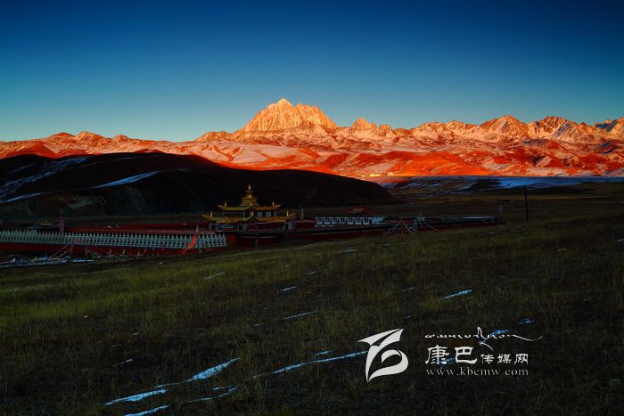 冬日的塔公草原。夕陽下,一個人緩步行在高低起伏、荒去了的草地。