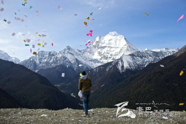 在車上,他很沉默,但當(dāng)車停靠在亞丁村口的觀景臺前時,他下了車,從懷里掏出一大疊小紙片,揚手撒出,神色虔誠。