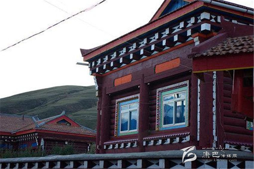 道孚民居的一般結構是以藏式木架穿逗,作為整體骨架,一般為二、三層;以片石或泥土砌墻,按正方形各邊7-10尺為空間立柱,四柱之間稱一空,一般房屋有16-30空,也有40、50空的。柱與柱之間有穿枋或原木鎖拉扯,其余維護結構由橫向平置,圓弧朝外的對剖圓木組成,它們層層重疊、四角交叉相搭,房頂高約5至8米。比起改進前,柱子直徑普遍加大,豪宅的柱子需兩人合圍,給人一種穩(wěn)重之感;底層和二層的木柱連體,并仿照內地建筑的木穿逗式結構,梁柱接榫,形成一個牢固的整體,以增強抗震能力。外形多為四方形,二樓呈L形、凹形或回形,內層結構是純木材,架“棒柯”或“棒勒”,間隔為各種用途的房間。房間上裝木望板,下鋪木地板,頂蓋用樺樹皮或硬雜木條墊底再鋪“阿嘎土”,日曬雨淋絕不漏水。屋架門窗外表的裸露部分,則多以油漆或自制的有色土染過,既防腐防蛀,又美觀大方。從外部看,二層平臺的女兒墻上,種滿了各種花草,房前屋后還種植了果樹。用泥土夯筑的底層和二層后方的土墻刷成白色,而木質的半圓木墻體涂成褐紅色,窗框和窗扇均作彩繪,室內裝飾也都用紅色等“火熱”的基調。各種色彩相互協(xié)調映襯,給人的印象特別深刻。
