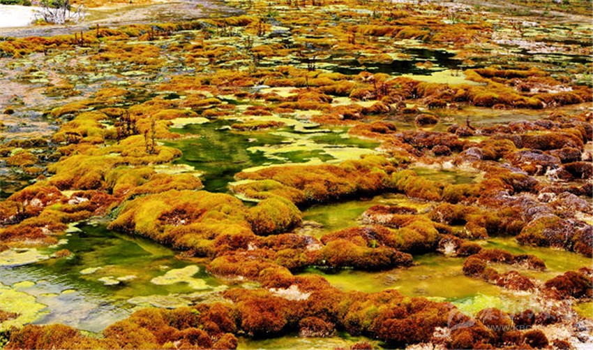 灘長(zhǎng)約3000米,寬約200米,共有7個(gè)臺(tái)階,上面形成了大小不一的彩池,里面的各類水生植物,暢游的羌活魚(小鯢)等,給這片古老的地質(zhì)奇觀帶來(lái)了無(wú)限的生機(jī)。在海拔4300米處,有一眼噴出1.5米高的溫泉,水溫常年在30度左右,是玉龍泉華灘的主要水源。
