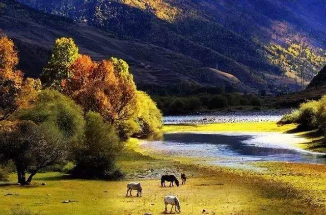 秋季,是稻城亞丁最具有詩意的季節(jié)?;鸺t、金黃、碧藍是自然這位大藝術家收藏已久最珍貴的顏料,這瞬間被洋洋灑灑潑灑在這天地之間。無論從什么角度看,取景框永遠是一幅美麗的畫面。