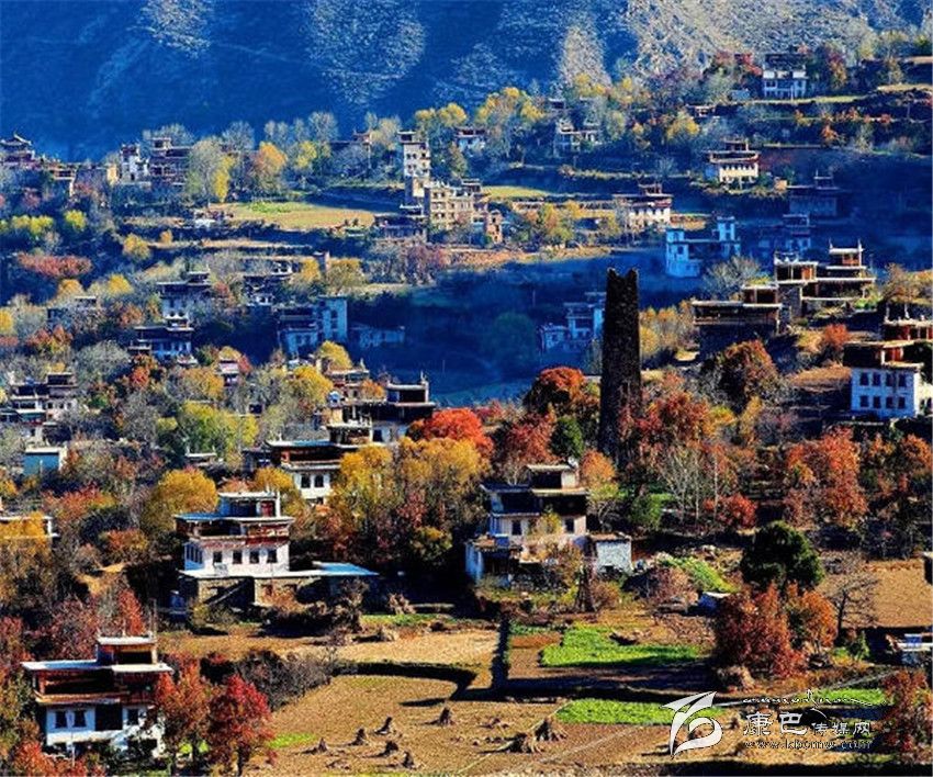 甲居藏寨面積約5平方公里,居住嘉絨藏族140余戶,藏寨從大金河谷層層疊疊向上攀援,一直伸延到卡帕瑪群峰腳下,整個山寨依著起伏的山勢迤邐連綿,在相對高差近千米的山坡上,一幢幢藏式樓房灑落在綠樹叢中。