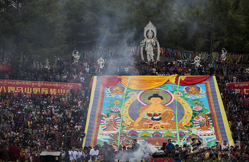 農(nóng)歷四月初八是釋迦摩尼的誕辰,這一天也是以藏傳佛教為主要信仰的康定人的重要日子。就連周邊地區(qū)的藏民也全部盛裝趕來。每逢這天,民眾自東關(guān)出、上跑馬山,寺廟的喇嘛們抬出巨幅唐卡畫卷曬佛,在法號(hào)聲聲中,眾人禮佛朝拜。在熱鬧的歌舞表演之后,再沿公主橋下,轉(zhuǎn)金剛寺、南無寺,沿阿里布果轉(zhuǎn)山步游道至子耳坡返回,轉(zhuǎn)山一圈,繞城一周,誦佛萬變,以紀(jì)念佛祖誕辰,并祈禱吉祥安康。
