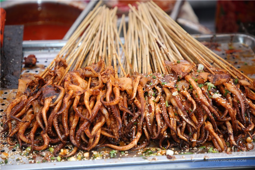 作為一個(gè)四川人,對(duì)于麻辣味的食物毫無(wú)抵抗力,在康定后街林立的商鋪中,記者一眼就相中了“深海魷魚花”這家店??粗褐t油的魷魚花靜靜地躺在紅椒和芹菜間,記者咽了咽口水,向老板買了一份兒?!罢媸羌兗兊拇ㄎ秲簺]錯(cuò)了,又麻又辣的?!庇浾邔?duì)老板說(shuō)。老板回答到:“魷魚花最講究的就是刀法了,要切得好看。雖然在顧客看來(lái)都差不多樣子,但是我每次都要經(jīng)過(guò)細(xì)細(xì)斟酌再一刀一刀的切,爭(zhēng)取多弄幾種樣式,現(xiàn)在我的??蛡円矔?huì)細(xì)細(xì)地考究我切的魷魚花了。以前我只賣烤魷魚,只是在家里偶爾會(huì)給我兒子做魷魚花,后來(lái)看我兒子喜歡吃,才開始慢慢地賣魷魚花,沒想到還是很受歡迎。這次美食節(jié),我發(fā)現(xiàn)沒有人做魷魚花,所以我就帶著我兒子喜歡的魷魚花來(lái)參加這次美食節(jié)了?!崩习逍χ浾哒f(shuō)。