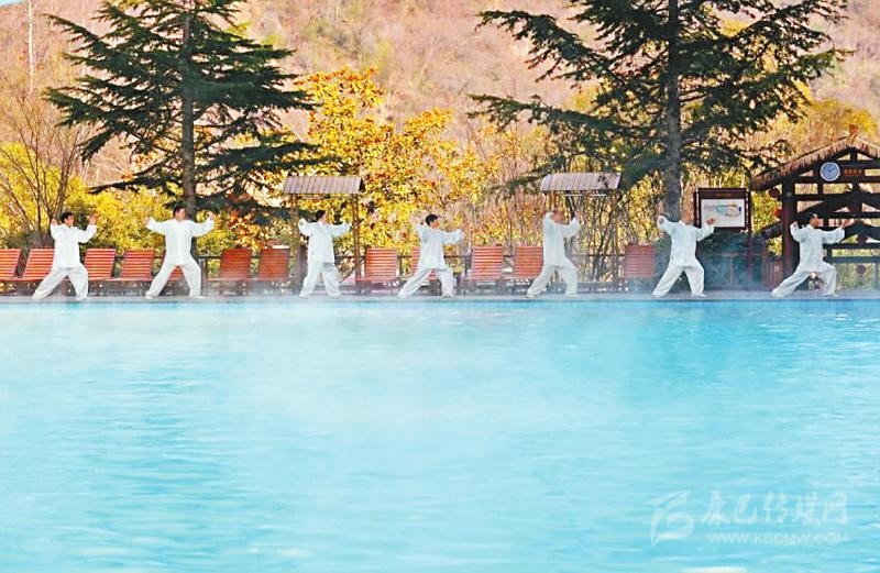 游客在天然溫泉邊做康養(yǎng)運(yùn)動。