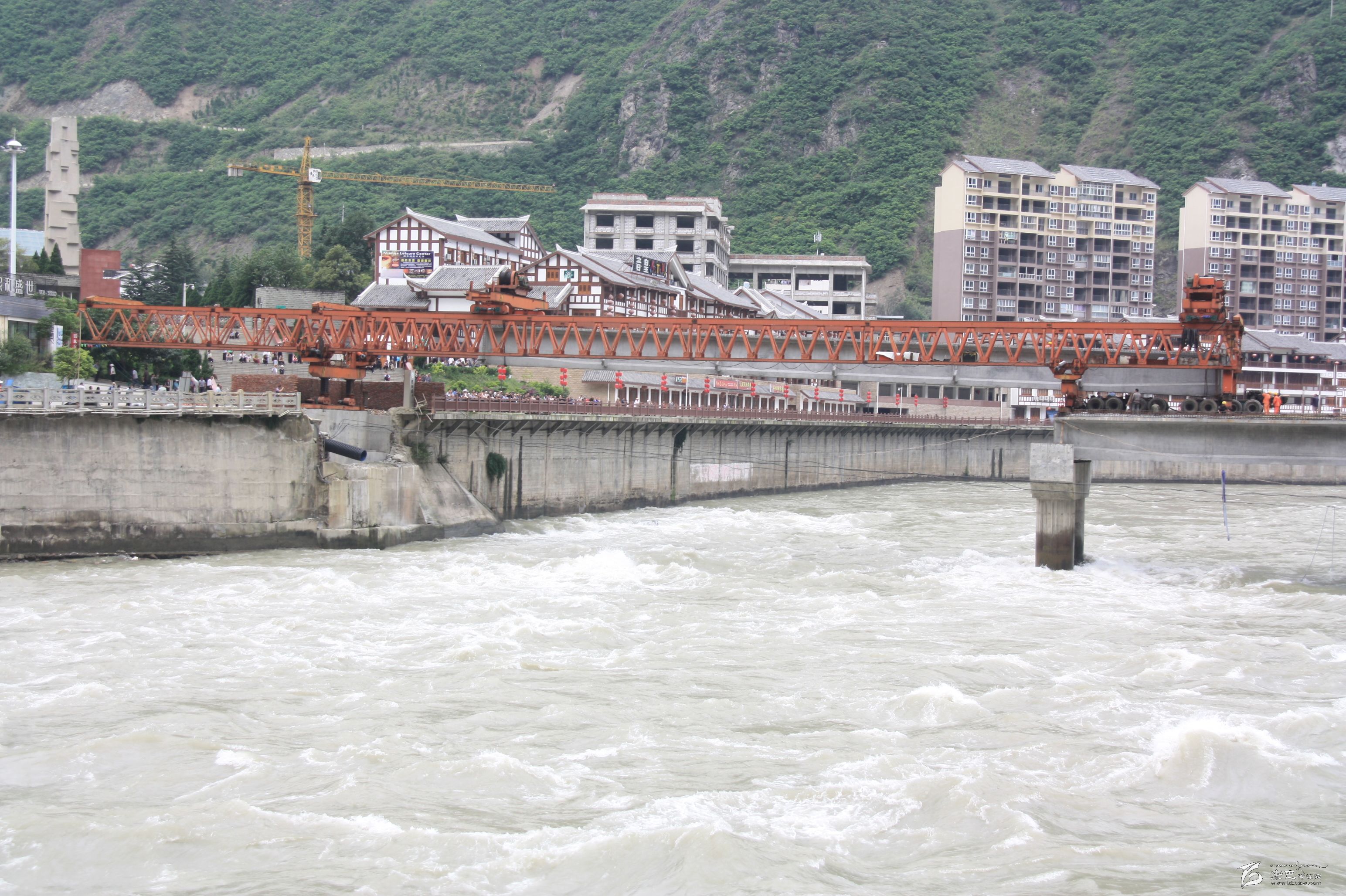 2015年9月中旬,葛洲壩集團瀘定項目部,順利、安全完成“城南大橋”拆舊建新第3跨T型梁的架通,標志新“城南大橋”主體修建成型。遠觀新橋氣派壯觀。目前大橋施工方正加緊工期,對新橋第三跨的橋面混凝土澆鋪硬化,接著是橋欄的安裝。施工方承諾:2015年10月底新橋先行通人,保證年底通車。屆時,一座引用原橋名,在原橋址上新建,屬特大預應力混凝土梁式(T型梁)主跨3跨,全長170米,橋面寬11.5米,其中2×2米人行道+7.5米機動車道,嶄新壯觀“城南大橋”同舊“城南大橋”一樣得到過橋人的敬重和欣慰。2013年12月被拆除的舊“城南大橋”由此從人們的視野中消失了。但橋名被保留下來了,舊橋的容貌被印在攝影愛好者的照片里了。