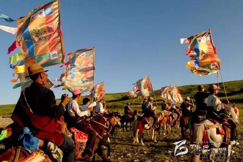 藏歷五月初四,就是色達(dá)牧民的祭神節(jié)。這天,牧民們在各色布上印上象征福氣的經(jīng)文,在經(jīng)旗周邊裝飾上白、紅、黃、綠、蘭布條。男子在自己的火槍槍架上,飾以經(jīng)幡,上邊掛一緞制煙祭用的小袋騎馬趕赴節(jié)日集會地點。