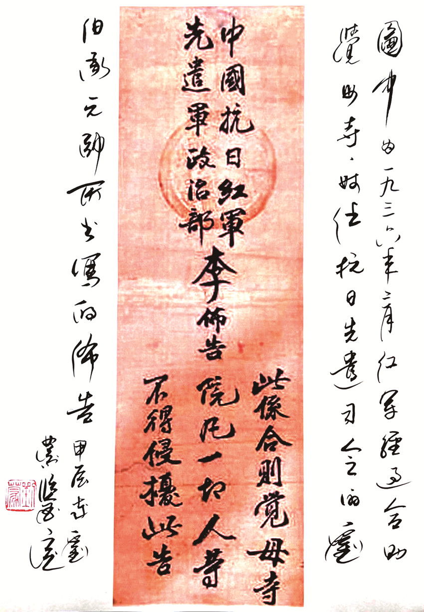 1936年2月,為執(zhí)行紅軍總部的《康道爐戰(zhàn)役計劃》,以劉伯承為中國抗日紅軍先遣軍司令員的紅30軍從雅安寶興翻越夾金山西進,經懋功、金湯、丹巴,攻取道孚、爐霍、甘孜地區(qū)。3月1日,紅30軍攻占道孚,25日,攻占爐霍,30日進駐甘孜縣。紅30軍來到甘孜縣合則覺母寺院附近,為打開當?shù)氐木置?,紅軍堅決執(zhí)行紀律,不干擾百姓。中國抗日紅軍先遣軍政治部以軍政委李先念的名義,頒布了保護覺母寺(尼姑庵)的布告。布告說“此系合則覺母寺院,凡一切人等不得侵擾,此告”。