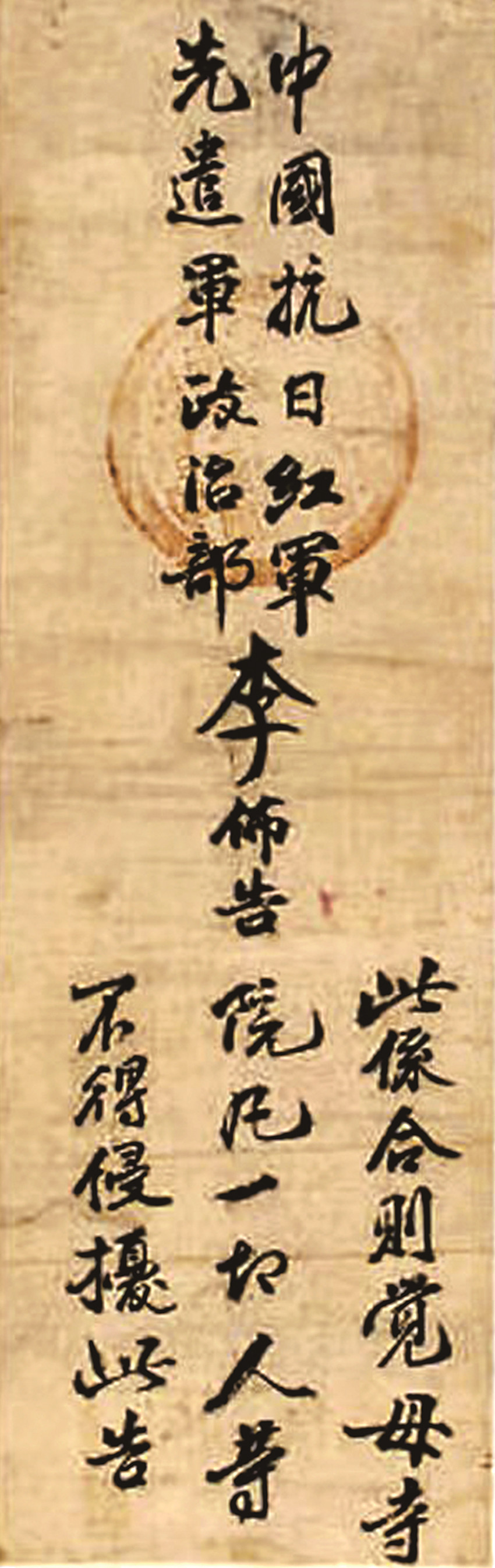 該布告和其他的布告在書寫形式上有所區(qū)別,不是現(xiàn)在常見的橫向的,是豎向的,按照上中下分三部分,發(fā)布方、責任人、發(fā)布內容。它的落款也就是發(fā)布方的單位在上面,左右對稱,蓋章可以辨認為:中國工農紅軍第四方面軍第三十軍政治部。中間是發(fā)布人李先念的姓李,比其他字大一倍,以示突出。在下方是布告的內容。書寫者以行書書寫,一氣呵成,整體結構勻稱,字體大小適中,內容簡明扼要。布告歷經多年,保存完好,說明寺院的收藏者對布告的內容認可,對書寫者書法充滿敬意。