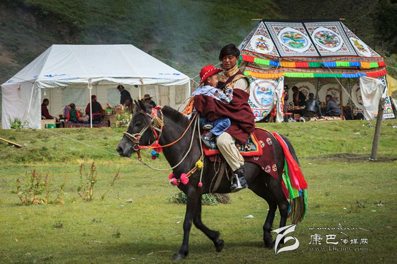 每年七月,當(dāng)斯?jié)纱甯裆;ㄅ诺臅r候,勞作了大半年的人們迎來了難得的短暫休閑,村里舉行為期三天的耍壩子活動。在箱子底下壓久了的盛裝和珍貴首飾穿戴出來了,曬了又曬的漂亮的帳篷搭起了,飄香的青稞美酒端出來了,坨坨肉也煮熟了,很久沒有舞動的長袖甩開在充滿花香的風(fēng)里。學(xué)校孩子們排練的小節(jié)目,也將像上央視春晚一樣華麗登場,接受鄉(xiāng)親們的檢驗。馬,賽馬,猶如風(fēng)之子,將在草原上一決高低。這一切,是那么的自然,那么的美好。盡管賽馬比賽的金牌是廢紙箱的紙片做成的,盡管獎品僅僅是幾條茶葉和一根潔白的哈達(dá),騎手參與的愿望還是那么強(qiáng)烈,取勝的激情還是那么的澎湃。