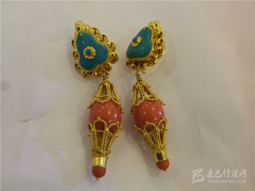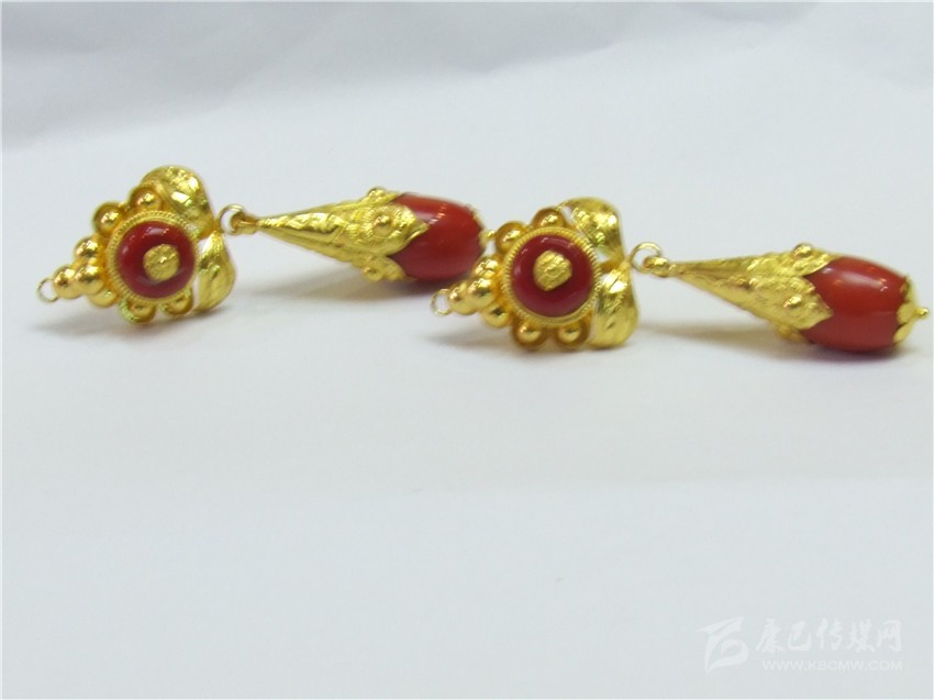 經(jīng)典的紅綠配耳環(huán)。撞色一直都是永不落伍的時(shí)尚,紅綠搭配的巧合,是藏民族熱愛(ài)生命與熱情好客的象征,用流光溢彩的金色將紅與藍(lán)包圍并連接,看起來(lái)協(xié)調(diào)而美好,搭配起來(lái)更為時(shí)尚。據(jù)店家介紹,此款耳環(huán)凈重22.75克,加上手工費(fèi),售價(jià)7000余元。