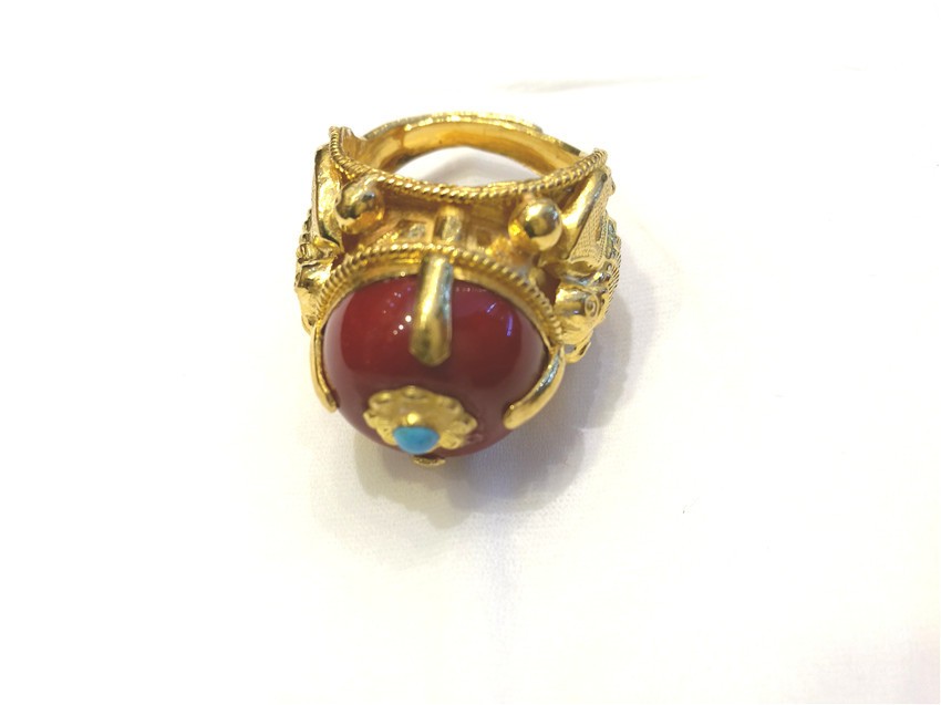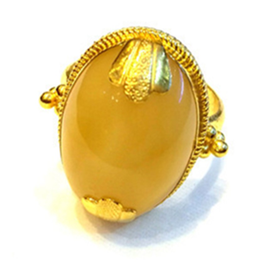 蜜蠟是藏家裝飾中的上成品,藏民族對(duì)蜜蠟的喜愛(ài)是非常誠(chéng)懇的,表達(dá)著他們對(duì)大自然的無(wú)限崇敬之情與大自然饋贈(zèng)的感謝之情。在他們看來(lái),蜜蠟除了能夠作裝飾品佩戴、收藏之外,最引人注目的就是靈性修行之功效,設(shè)計(jì)師在此款戒指的設(shè)計(jì)上,緊扣藏民對(duì)蜜蠟的喜愛(ài),并將漢式花邊與蜜蠟結(jié)合,是對(duì)藏漢文化交流較好的體現(xiàn)。