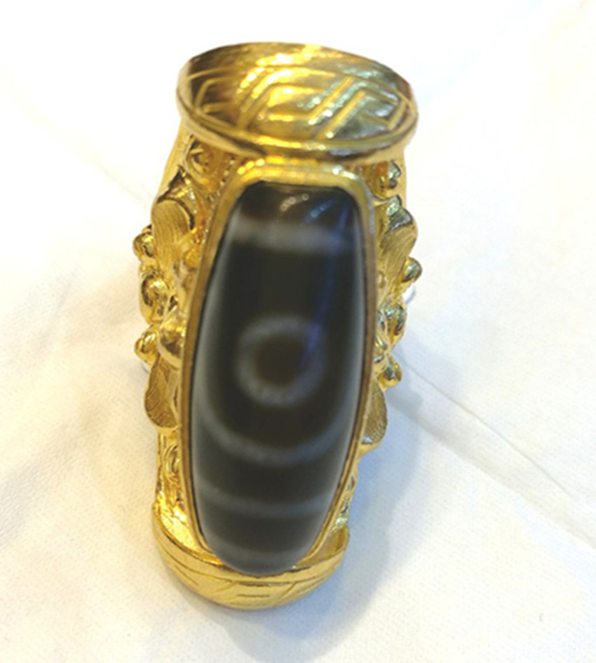 天珠,一種神秘而珍貴寶珠,不僅具有裝飾搭配的作用,更寓意著平安、好運(yùn)。藏族人認(rèn)為能夠供養(yǎng)一顆老天珠既是有了福報(bào),并相信能夠獲得意想不到的吉祥和圓滿(mǎn)。珍貴的天珠鑲嵌在做工精細(xì)的黃金花紋里,不僅是對(duì)時(shí)尚潮流的追隨,更是虔誠(chéng)信仰的一種體現(xiàn)。