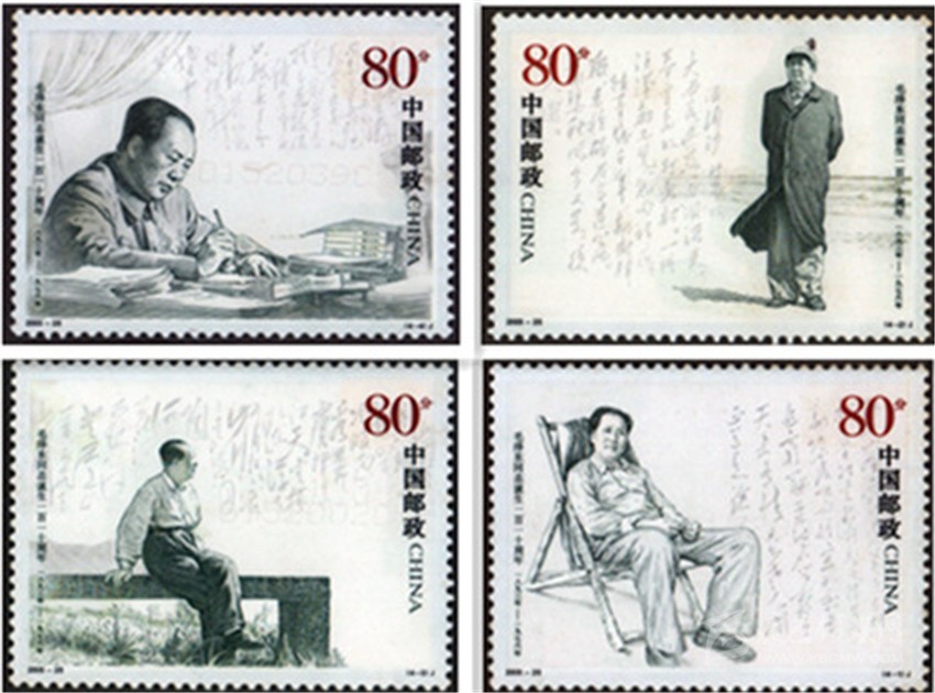 2003年12月6日, 中國(guó)郵政發(fā)行《毛澤東同志誕生一百一十周年》紀(jì)念郵票一套4枚,分別表現(xiàn)了毛澤東在西柏坡、毛澤東在北戴河、毛澤東在廬山、毛澤東在廣州的不同形象,背景以相應(yīng)的毛澤東詩(shī)詞書法襯托,偉人的豐姿躍然票上。這套以照片為基礎(chǔ)采用膠雕套印大票面黑白兩色的郵票,樸素大方,典雅大氣。郵票中的人物形象從面部表情到坐立姿態(tài),都顯出神采奕奕、栩栩如生。