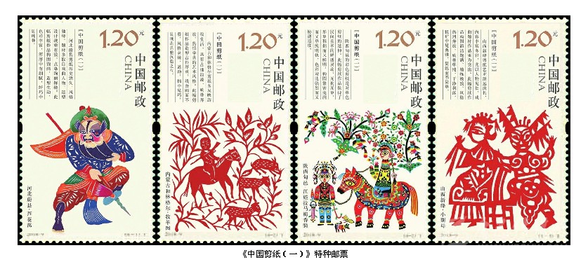 2018年1月24日,中國郵政發(fā)行《中國剪紙(第一組)》特種郵票,全套4枚。這是中國郵政繼1959年1月1日發(fā)行的《剪紙》特種郵票59年后重新發(fā)行的《中國剪紙》系列郵票。全系列郵票計(jì)劃發(fā)行4組,每組4枚。這次發(fā)行的第一組4枚郵票入選內(nèi)容分別是被列入第一批國家級(jí)非物質(zhì)文化遺產(chǎn)名錄的北方四處剪紙傳承人的作品:第一枚“河北蔚縣·蘆花蕩”,河北蔚縣剪紙歷史悠久,風(fēng)格獨(dú)特,題材多取自于人物,造型設(shè)計(jì)疏密有致,點(diǎn)染絢麗鮮艷。此幅作品作者王老賞(1890-1951),河北省蔚縣南張莊村人;第二枚“內(nèi)蒙和林格爾·牧羊圖”,內(nèi)蒙古和林格爾剪紙多反映游牧生活,具有古拙浪漫、質(zhì)樸奔放、熱情率真的藝術(shù)風(fēng)格。此幅作品作者張花女 (1903-2004),和林格爾縣董家營鄉(xiāng)曹老八夭村人;第三枚“陜西旬邑·江娃拉馬梅香騎”,陜西旬邑的彩色剪紙具有民間美術(shù)的鮮活靈動(dòng),無拘無束,形象稚拙而又鮮明,構(gòu)圖緊密完滿而又單純明快,色彩對(duì)比強(qiáng)烈而又協(xié)調(diào)適度。此幅作品作者庫淑蘭(1920-2004),陜西咸陽市旬邑縣張洪鎮(zhèn)赤道鄉(xiāng)富村人;第四枚“山西新絳·小別母”,山西新絳剪紙藝術(shù)源遠(yuǎn)流長,內(nèi)容豐富多彩,尤以人物見長,戲曲題材作品更為突出,構(gòu)圖簡潔飽滿、精煉極致,粗獷中見典雅,簡煉而不簡單。此幅作品作者蘇蘭花(1906-1995),山西運(yùn)城市新絳縣澤掌鎮(zhèn)北蘇村人。