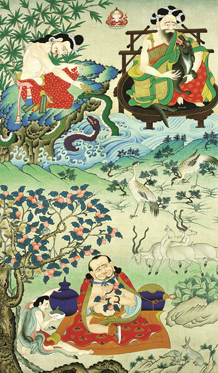 欽孜派的開山鼻祖是貢嘎崗堆·欽則欽莫。從技法上講,勉唐、欽孜兩派的技法都是繼承尼泊爾繪畫“重彩平涂”的畫法,欽孜畫派還擅長對同類色的豐富調(diào)配,以及在石色之上用透明色暈染的技法使用。從風(fēng)格上看:兩派有著相同的藝術(shù)追求,但欽則畫派是在保守的創(chuàng)新,雖然它也吸收漢地藝術(shù)畫了很多山水,但它的山水元素只是為了填補畫面,沒把背景山水從作為一幅畫來考量;它的畫面常用直線形來分隔風(fēng)景,近似像平涂色塊的版畫。(未完待續(xù))