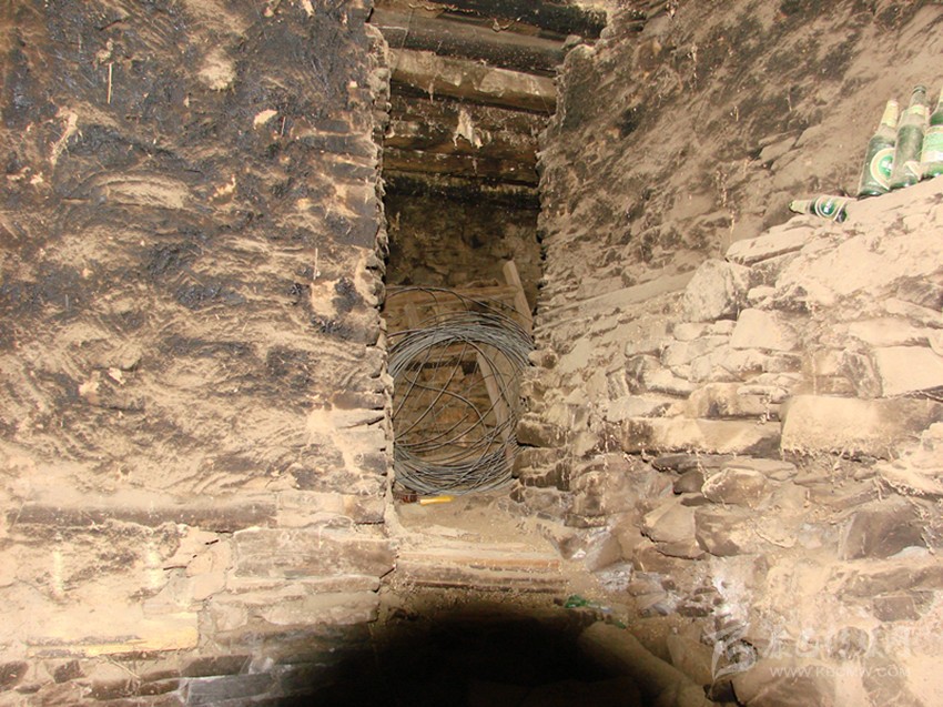 鍋莊房后,有兩道門,其中一間為放置糧食的庫房。而另一間房屋,門檻高于鍋莊房許多,需要跨上兩級臺階才能上去。門較矮小,打開房門,一股潮濕的氣味撲鼻而來,眼前一片漆黑,什么也看不見。我打開隨聲攜帶的電筒,借助微弱的光線,勉強能看見房屋內(nèi)的擺設。房屋的右面角落里,有用木頭搭建起來的籠子,其高約一百三十厘米,寬約一百厘米。在房屋的左邊,有一曲折的甬道,也需要走上兩級臺階。牟大哥告訴我,這里是用來關押犯人的地方。