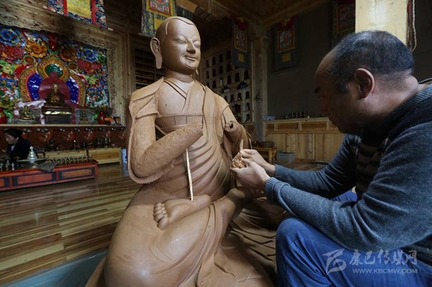 見到克村時(shí),他正在鄰村一農(nóng)戶的經(jīng)堂里制作佛像,盤坐在蓮花寶座上的宗喀巴大師和兩個(gè)弟子身披袈裟手持經(jīng)書的泥塑作品神形兼?zhèn)?,這是克村和徒弟多登近半個(gè)月的心血??舜遄诓級|上,心無旁騖神情專注地,用木制工具對作品進(jìn)行打磨,旁邊擺放著一盆清水和一筐自制的工具。
