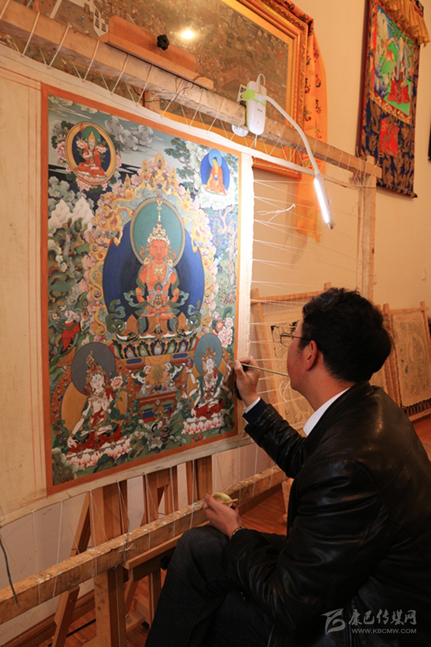在十多年的繪畫生涯中,著著接觸了很多畫師,經(jīng)常與他們一起交流,并在不斷的摸索與總結(jié)中讓自己的技藝得到不斷提升,為了潛心作畫和讓更多愛好唐卡畫的青年學(xué)習(xí)唐卡畫,家在農(nóng)村的著著在城里租房開設(shè)了現(xiàn)在的畫室,并招收了徒弟。目前,著著歷時(shí)四個(gè)月以宗教為題材潛心創(chuàng)作的唐卡畫《釋迦牟尼》,已投送到第二十屆杭州西湖國際博覽會中國民間藝術(shù)產(chǎn)業(yè)示范展會上,他想通過參加展會的方式讓更多人了解被列為非物資文化遺產(chǎn)的藏族唐卡畫和藏民族文化。