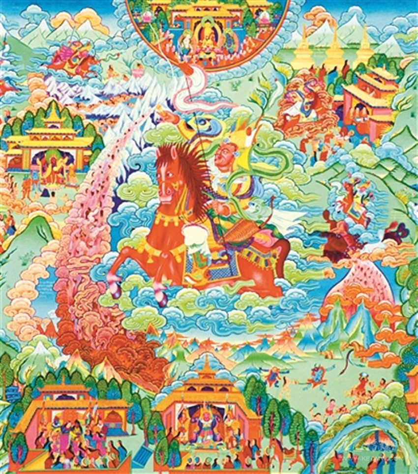 “中間世上各種紛爭(zhēng)”,講的是格薩爾從誕生到升天的全過程,這一部分,構(gòu)成了格薩爾的全部英雄業(yè)績(jī),也是史詩(shī)的主體部分。