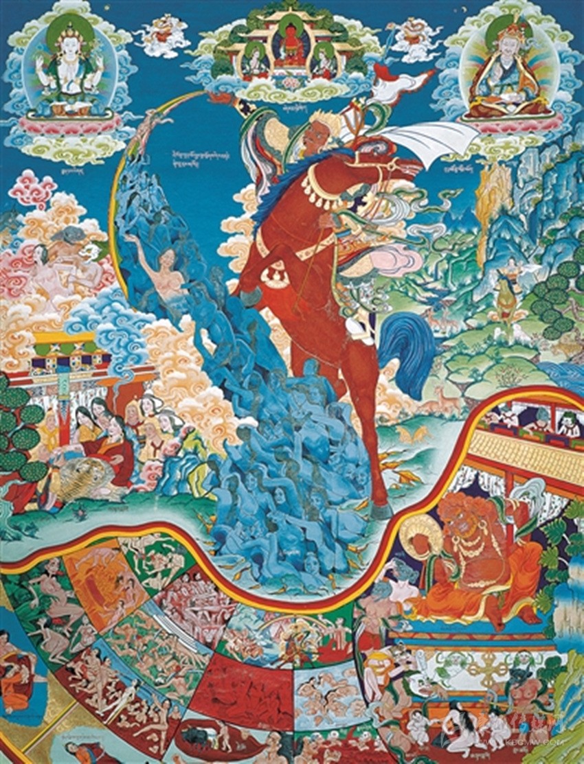 格薩爾唐卡,藏語(yǔ)叫“仲唐”?!爸佟奔础陡袼_爾》故事;“唐”即唐卡,“仲唐”就是畫有《格薩爾》內(nèi)容的唐卡畫。那么,唐卡與古老的藏族英雄史詩(shī)《格薩爾》之間又有什么聯(lián)系呢?作為民間文學(xué)的史詩(shī)《格薩爾》主要靠民間藝人的說唱得到繼承和廣泛流傳。為了加強(qiáng)說唱時(shí)的效果,一些聰明的藝人就以《格薩爾》為題材,繪制人物畫和格薩爾故事,類似佛教繪畫中的佛本生故事和高僧大德的畫傳,說唱時(shí)把它們懸掛起來,邊解釋,邊演唱。這種演唱形式,被稱作“指畫說唱”。這就是有關(guān)《格薩爾》最早的唐卡。“一畫一世界”,在說唱藝人們看來,在一幅并不很大也算不上很精美的唐卡里,整個(gè)大千世界、英雄格薩爾的輝煌業(yè)績(jī),都包括在里面了。久而久之,成為一種專門的類型,稱作“仲唐”——畫有格薩爾故事的唐卡。