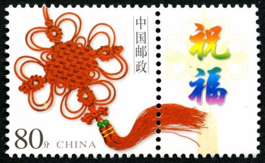 2002年5月10日,中國郵政發(fā)行《如意》個(gè)性化服務(wù)專用郵票一枚。主票圖案為如意柄端系著一個(gè)紅色“中國結(jié)”,附票有“祝?!倍?; 2003年3月3日,中國郵政發(fā)行《同心結(jié)》個(gè)性化服務(wù)專用郵票一枚。主票圖案為盤長(zhǎng)結(jié)4邊編織有心型繩結(jié)的同心結(jié),附票為“祝?!倍?;2006年9月25日,中國郵政發(fā)行《中華全國歸國華僑聯(lián)合會(huì)成立五十周年》紀(jì)念郵票一枚。圖案為阿拉伯?dāng)?shù)字“5”與中華全國歸國華僑聯(lián)合會(huì)圓形會(huì)徽組成數(shù)字“50”,象征全國僑聯(lián)五十周年,背景畫面為淡淡的粉紅色“中國結(jié)”。寓意歸國華僑與全國人民血肉相連,同心同德共同建設(shè)美好家園;2013年8月8日,中國郵政發(fā)行一枚《美好祝福》賀卡專用郵票,圖案為象征喜慶的紅色“中國結(jié)”;2014年9月20日,中國郵政發(fā)行《中國夢(mèng)(二)——民族振興》特種郵票,其中第四枚“民族團(tuán)結(jié)”,圖案中載歌載舞的各民族群眾上方有一個(gè)大紅的“中國結(jié)”,象征著各民族大團(tuán)結(jié)。