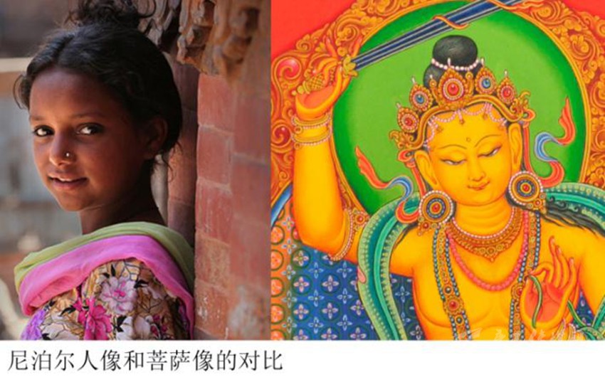 特別值得注意的是:之前佛教藝術(shù)的帕拉風(fēng)格繪畫(huà)中的臉型普遍是方正偏長(zhǎng)的,而在尼瓦爾唐卡里,臉型普遍是方正偏短。偏短的方臉會(huì)讓五官顯得更加集中一點(diǎn),特別是眉額比較大、眼睛位置下移,這樣的感覺(jué)有點(diǎn)近似于嬰兒的面部比例。而眉骨、鼻骨高挺,又不似兒童,這樣的面部特征其實(shí)和尼國(guó)人的長(zhǎng)相比較接近。也許是尼瓦爾人善于觀察、擅長(zhǎng)描摹的天分,逐漸把本民族沉靜的性格與容貌,潛移默化地滲透進(jìn)了唐卡,產(chǎn)生了新的風(fēng)貌。