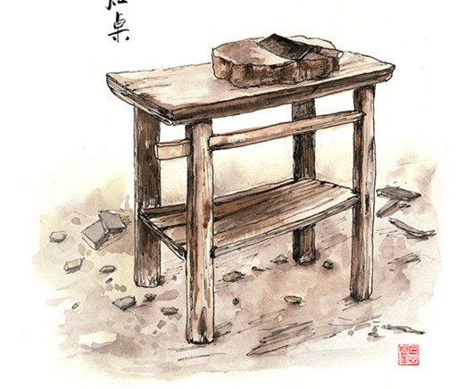 在我們家,灶屋里砌著一個(gè)四方形兩灶孔的大正灶,兩條寬板長(zhǎng)凳靠墻擺放,交于墻角,像木匠的大曲尺,半圍著象征一家之主的正灶,其中一條正對(duì)著灶門(mén)口。灶與凳之間的通道,僅容曲膝而坐。灶上常年擱著烏黑的鼎灌和鐵鍋,灶的背面則立著一張長(zhǎng)條狀的灶桌。灶桌是洗碗和切菜的地方,在其橫長(zhǎng)的縫隙里插上接手板,懸空于灶面之上,擺上碗筷,又起到了飯桌的功能。灶屋進(jìn)門(mén)的另一面墻,靠墻而立的,是高高的碗欃和一個(gè)瓦水缸。碗欃是平素放碗放剩菜的地方,本是漆了老紅色,卻因西墻的木格窗小,光線(xiàn)幽暗,與四壁及樓板的烏黑融為了一體。水缸上口有一塊擱板,板上放兩只寬口瓦缽,缽里各放著一只竹筒水勺,一大一小。每天早晚,家人擔(dān)了木桶,挑來(lái)井水倒入水缸,此處的地面,長(zhǎng)年潮濕。灶屋是我們一日三餐吃飯喝茶休息閑談的場(chǎng)所,煙火歲月,多是在此度過(guò)。我開(kāi)蒙上小學(xué)后,每到夜晚,吃過(guò)飯后,將煤油燈盞移到寬板長(zhǎng)凳,雙膝跪地,伏在凳灶之間的空隙里寫(xiě)作業(yè),有時(shí)一不小心,額前頭發(fā)就被燈盞的火焰燒得焦臭。我自小愛(ài)學(xué)習(xí),成績(jī)很好,每學(xué)期都有獎(jiǎng)狀,老師夜里來(lái)村間家訪(fǎng)時(shí),也常來(lái)我家坐,是我父母最大的榮光。