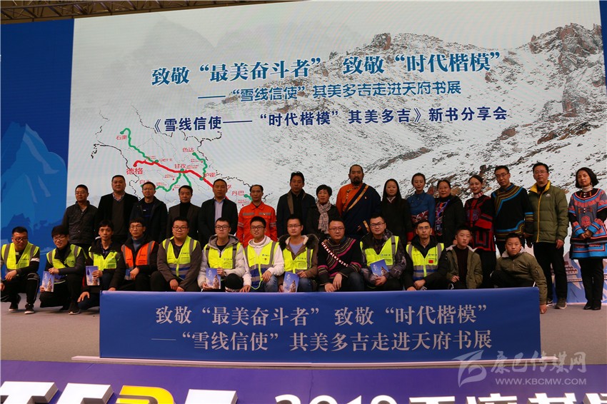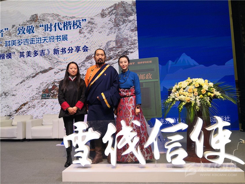 在分享會舞臺的一側(cè),靜置著書籍《雪線信使——“時代楷模”其美多吉》放大后的封面。封面上,其美多吉、藍(lán)天與雪山相得益彰,構(gòu)成了一幅獨(dú)具特色的畫面。