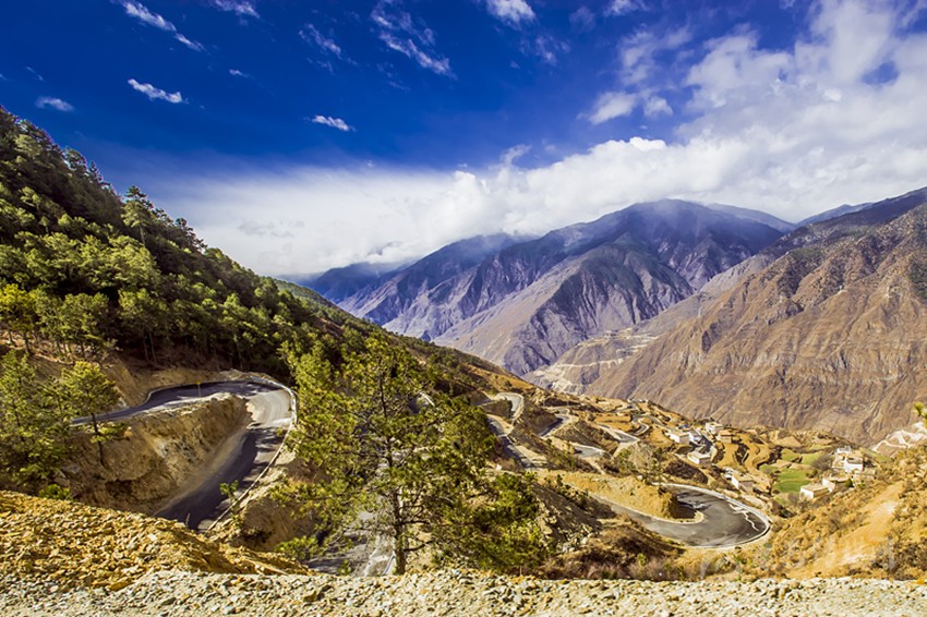 如今,所有鄉(xiāng)村通了硬化路,橫跨在金沙江上的十余座跨江大橋氣貫如虹,天塹變通途。過(guò)去我們下鄉(xiāng)時(shí),從日雨到曲雅貢,只有一條從因都?jí)伪澈蟮陌肷窖贰In茫大山,路上幾乎看不見(jiàn)一顆大樹(shù),也找不到一滴水源。從山腰看江畔的因都?jí)危挥袃蓱?hù)人家,幾株綠樹(shù)總令焦渴難耐的我們望“綠”興嘆!下山走到金沙江邊,熾烈陽(yáng)光從河灘上反射,火辣辣照在臉龐和皮膚,熱浪令人窒息,感覺(jué)目的地遙不可及?,F(xiàn)今,干部下村完全不需要走路,走路下鄉(xiāng)對(duì)年輕人來(lái)說(shuō)簡(jiǎn)直不可思議。公路像一條飄帶環(huán)繞山間,使散落在峽谷中的村寨愈發(fā)展現(xiàn)出欣欣向榮的新風(fēng)貌。