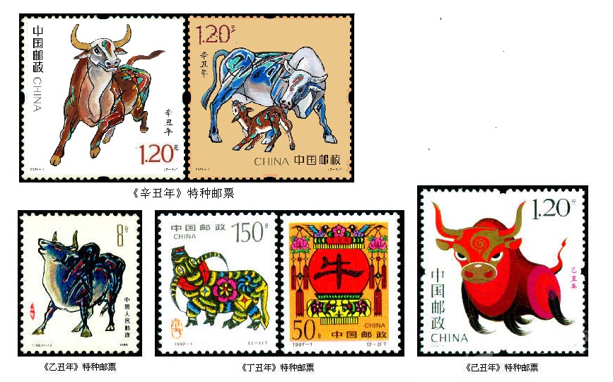 1997年1月5日發(fā)行第二輪生肖郵票中的“牛票”,即《丁丑年》特種郵票,全套2枚。由郵票設(shè)計(jì)師呼振源設(shè)計(jì)。第一枚“金牛奮蹄”,畫面依據(jù)山東省高密縣方市鄉(xiāng)前曹戈莊村當(dāng)時(shí)33歲的農(nóng)村女子齊秀花的剪紙作品《媳婦騎牛圖》進(jìn)行設(shè)計(jì),原作中的“媳婦”被刪去,突出了牛的形象,體現(xiàn)出膠東地區(qū)民間剪紙藝術(shù)源于生活、構(gòu)思巧妙、粗獷中多見細(xì)膩的本色。只見那彎彎的牛角,垂地的長(zhǎng)尾,壯實(shí)的牛身,穩(wěn)健的四蹄,都真實(shí)地再現(xiàn)了生活中牛的特點(diǎn),牛身上似花非花,似銅錢又非銅錢的紋飾,充分地表現(xiàn)出樸實(shí)的浪漫主義。第二枚“牛耕年豐”,畫面主圖為一只高高掛起的大紅燈籠上,映出了一個(gè)醒目的隸書“?!弊?,為牛年的慶春象征。圍繞著這只燈籠,又進(jìn)行了幾多創(chuàng)意,兩只喜鵲和一朵梅花,喻意“喜鵲登梅”;旒蘇上的兩朵牡丹,代表幸福、富貴;特別是那春意盎然的“雙牛圖”,畫面雖小,確為點(diǎn)睛之筆,與主圖的大“牛”字緊密呼應(yīng)。