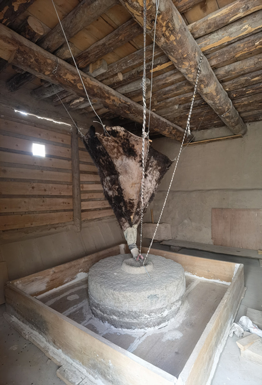 一條約三米寬的水渠橫穿眼前,水渠在側(cè)面依次開了七個(gè)口子。上游三個(gè)用來排水,冬天用隔板擋著,夏天則用來泄水。中游三個(gè)口子都是磨坊的動(dòng)力來源。走進(jìn)去是一處水磨坊,三座半徑約0.8米的石磨間隔1.7米一字排開。頂端是牛皮制成的青稞喂料器,由四根繩子系在房間頂角的不同方向;尾端是由牛角制作的喂料嘴,略顯復(fù)雜的繩拉式調(diào)節(jié)器錯(cuò)綜復(fù)雜,但卻精妙無比地控制著青稞的出料速度。