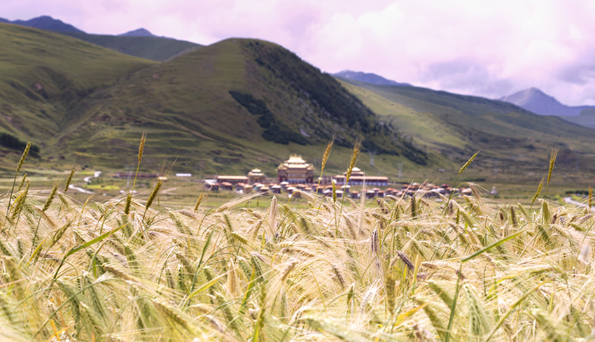 甘孜縣地處橫斷山脈的東北邊緣,康北地區(qū)腹心地帶,雅礱江從這里緩緩流過,肥沃的土壤和無垠的土地總會(huì)配上澄徹晴朗的天空。一顆顆飽滿金黃的青稞常在風(fēng)里搖晃著秋天,“康北糧倉”的美在這時(shí)展現(xiàn)得淋漓盡致。